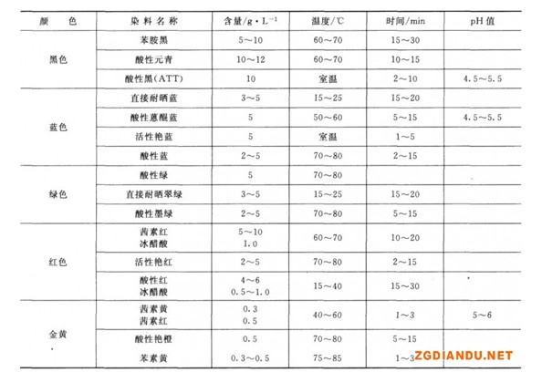 由于氧化膜具有多孔性和強的吸附能力因而可以染上不同的顏色。最適宜直接著色的氧化膜是從硫酸溶液中得到的陽極氧化膜,它使大多數鋁及鋁合金形成無色透明膜,有適宜的厚度、孔隙率和吸附性。草酸陽極氧化工藝較硫酸工藝價格高,得到黃色膜。當膜層超過50μm即得到自然的黃色或棕色。鉻酸陽極氧化工藝由于膜薄、孔隙少,而且它本身是灰色的,一般不宜著色。著色對氧化膜的要求是膜厚適宜、有足夠的孔隙和良好的吸附能力、無外傷和污染。表7—5列出鋁及鋁合金有機染料著色工藝。